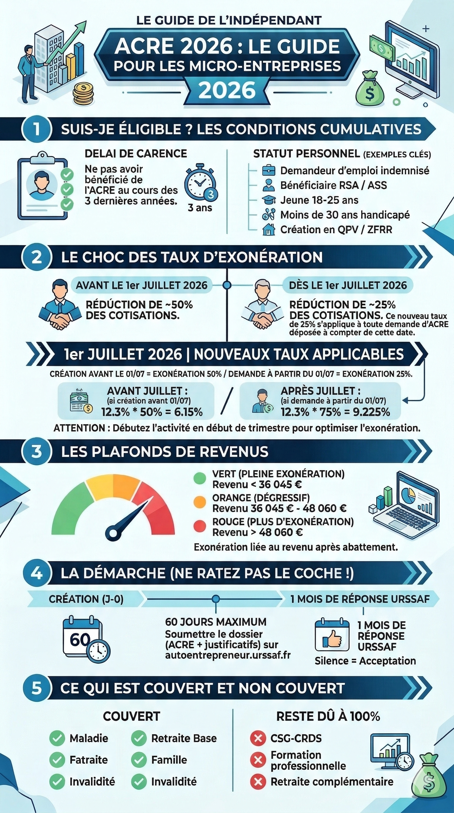 Les conditions de l’exonération des charges sociales (ACRE) ont changé en 2026. Entre les nouveaux plafonds de revenus, les délais de carence de 3 ans et la procédure de demande obligatoire sous 60 jours, les pièges sont nombreux.