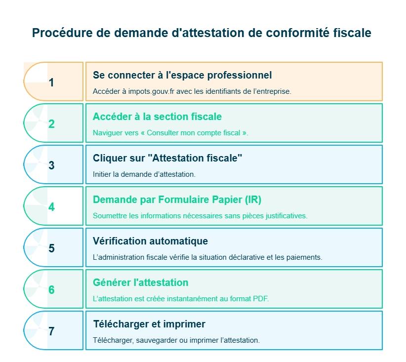La demande se fait en ligne sur impots.gouv.fr ou via le formulaire 3666-SD selon le régime fiscal. Si tout est conforme, l’attestation est délivrée immédiatement en PDF. En cas de refus, vous devez régulariser déclarations et paiements.