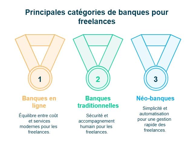 Pour faire simple, les banques pour freelances se répartissent en trois grandes catégories. Les banques traditionnelles privilégient l’accompagnement mais restent coûteuses. Les banques en ligne offrent un bon compromis entre services et frais maîtrisés. Les néo-banques misent sur la simplicité et l’automatisation, avec quelques limites fonctionnelles.