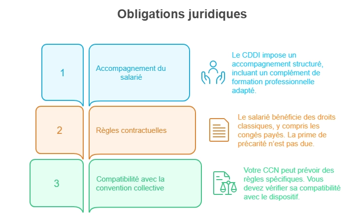 Le CDDI impose un accompagnement structuré. Vous devez organiser un suivi du salarié. Cela inclut un complément de formation professionnelle adapté.