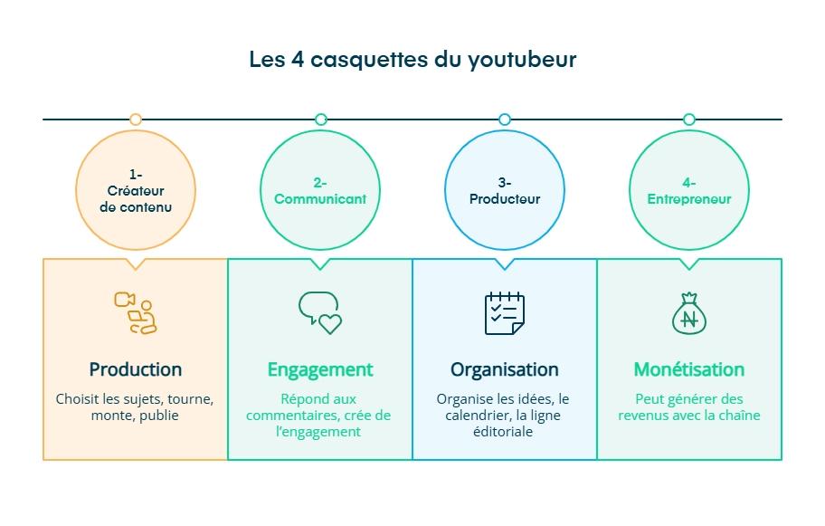- Producteur : vous organisez vos idées, votre calendrier, votre ligne éditoriale. La ligne éditoriale correspond au fil conducteur de votre chaîne.