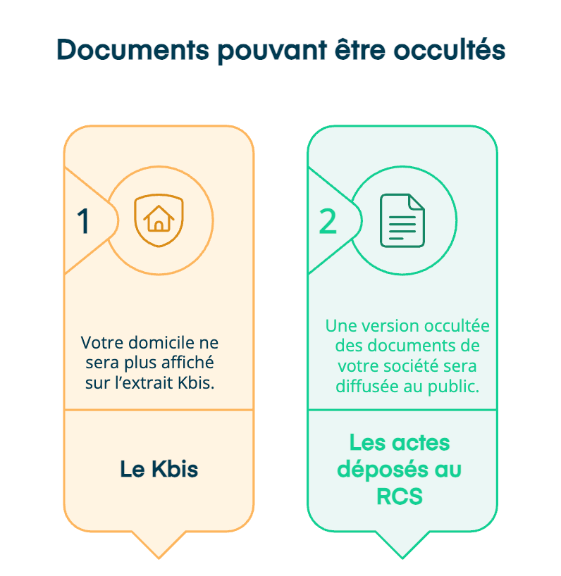 - Le Kbis :Si vous demandez l’occultation, votre domicile ne sera plus affiché sur l’extrait Kbis que peut obtenir n’importe quel tiers. Un fournisseur qui consulte votre Kbis ne verra plus votre adresse personnelle, mais seulement la mention officielle.