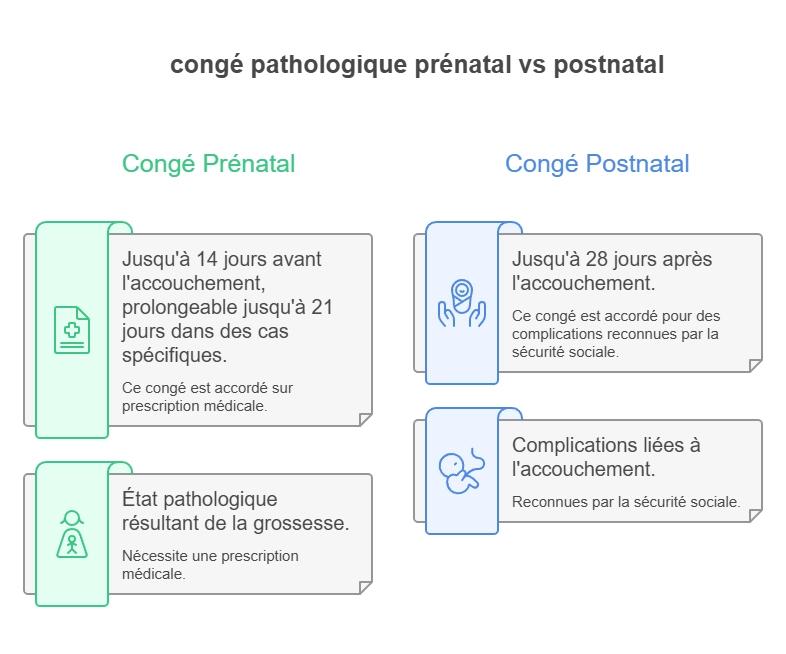 Exemple : une salariée peut cumuler 14 jours de congé pathologique prénatal et 28 jours de congé pathologique postnatal, soit jusqu’à 42 jours d’absence.