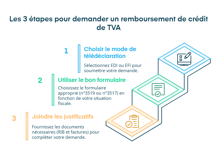 - Ensuite, faites la demande en 3 étapes : choisir le mode de télédéclaration (EDI via votre comptable ou EFI dans votre espace pro), utiliser le bon formulaire (3519 ou 3517), puis joindre les justificatifs (au minimum un RIB, et parfois des factures d’immobilisations).