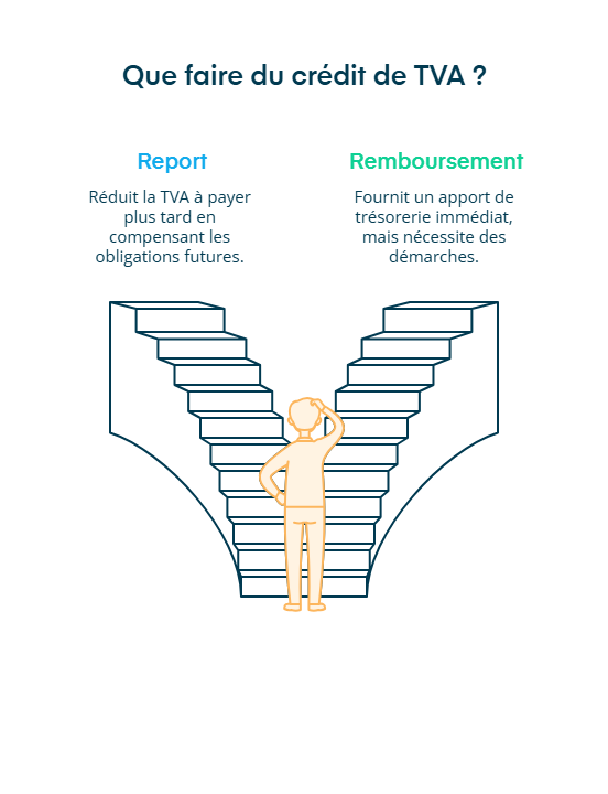 - Vous avez alors deux options : le reporter sur une prochaine déclaration (il viendra diminuer la TVA à payer plus tard) ou demander un remboursement à l’administration fiscale, sous conditions (régime de TVA, montants minimum, formulaires et justificatifs comme un RIB).