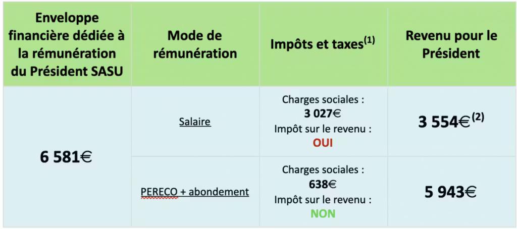 Lecture : avec une enveloppe financière de 6 581€, si le Président décide de se rémunérer avec un salaire, son revenu sera alors d’environ 3 554€ hors impôt sur le revenu. Au contraire, avec la même enveloppe financière, en optant pour le PERECO et l’abondement, son revenu sera alors de 5 943€ et exonéré d’impôt sur le revenu.