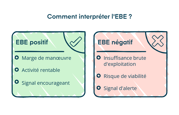 - Un EBE positif signifie que l’activité est rentable dans son fonctionnement quotidien.