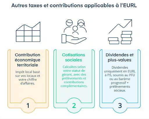 En complément de la TVA, l’EURL est redevable de la contribution économique territoriale (CET). Elle se compose de la cotisation foncière des entreprises (CFE), calculée sur la valeur locative des locaux ou terrains utilisés, et de la cotisation sur la valeur ajoutée des entreprises (CVAE), due uniquement au-delà d’un certain seuil de CA. Le montant varie selon l’activité et la commune d’implantation, ce qui en fait une charge annuelle à anticiper dans le budget de l’entreprise.