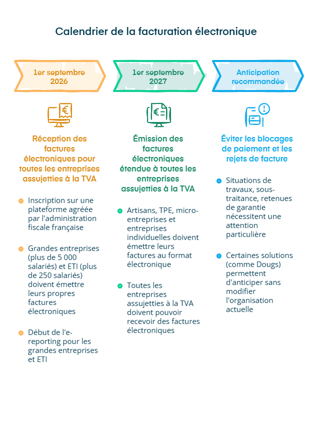 - Le calendrier lié à cette réforme est déjà fixé, et l’enjeu n’est pas de changer votre manière de travailler sur vos chantiers, mais d’adapter la façon dont vos factures sont émises et transmises.