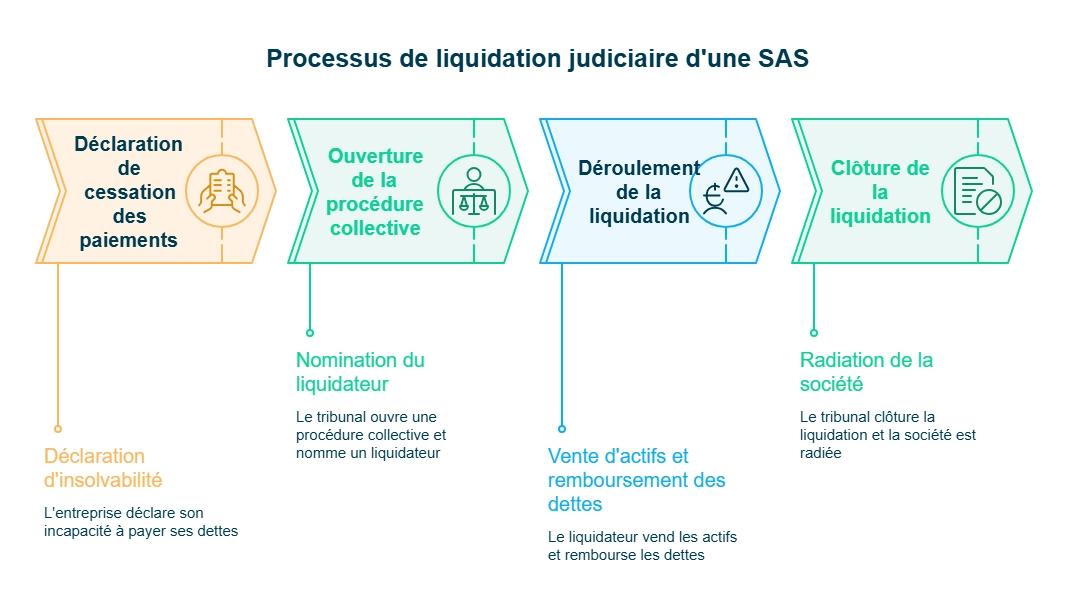 - Difficultés économiques : la SAS rencontre des difficultés financières ou une insuffisance d'actif ne permettant plus de régler les dettes. En cas de cessation des paiements, la loi impose une liquidation judiciaire.