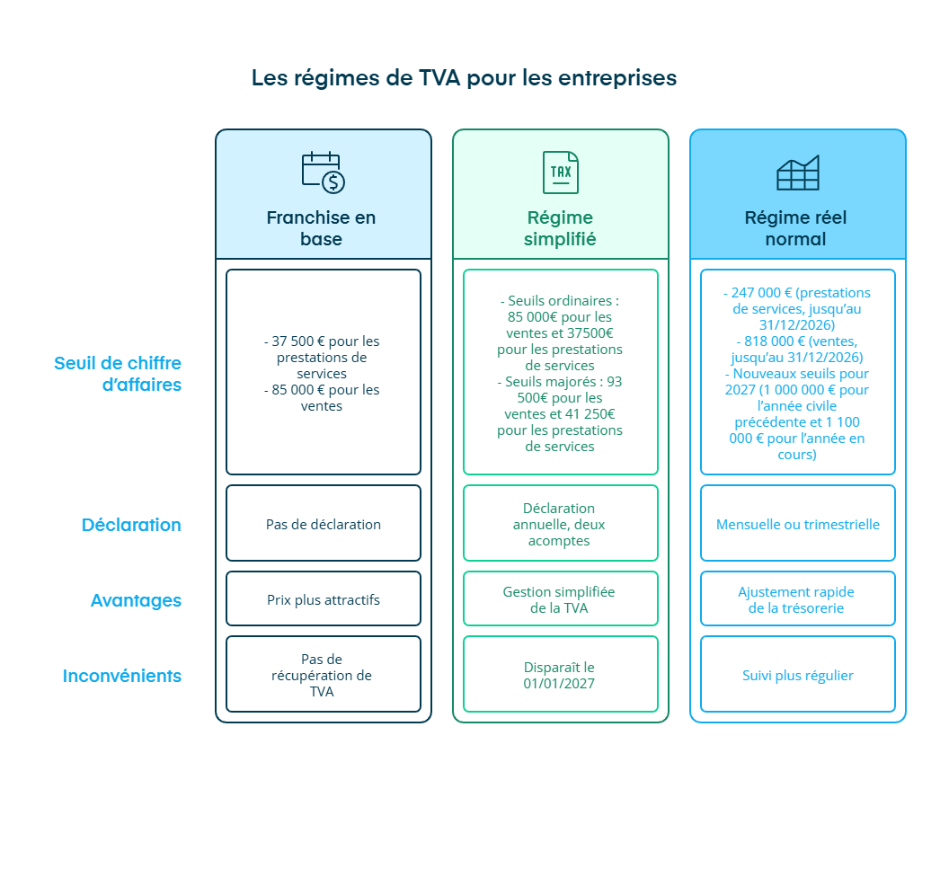 Enfin, selon votre chiffre d’affaires, vous relevez de la franchise, du régime simplifié jusqu’en 2026 ou du régime réel normal, chacun avec ses propres obligations déclaratives.