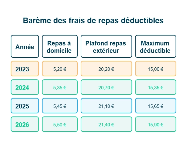 Le montant maximal déductible pour un repas en 2026 est donc de :