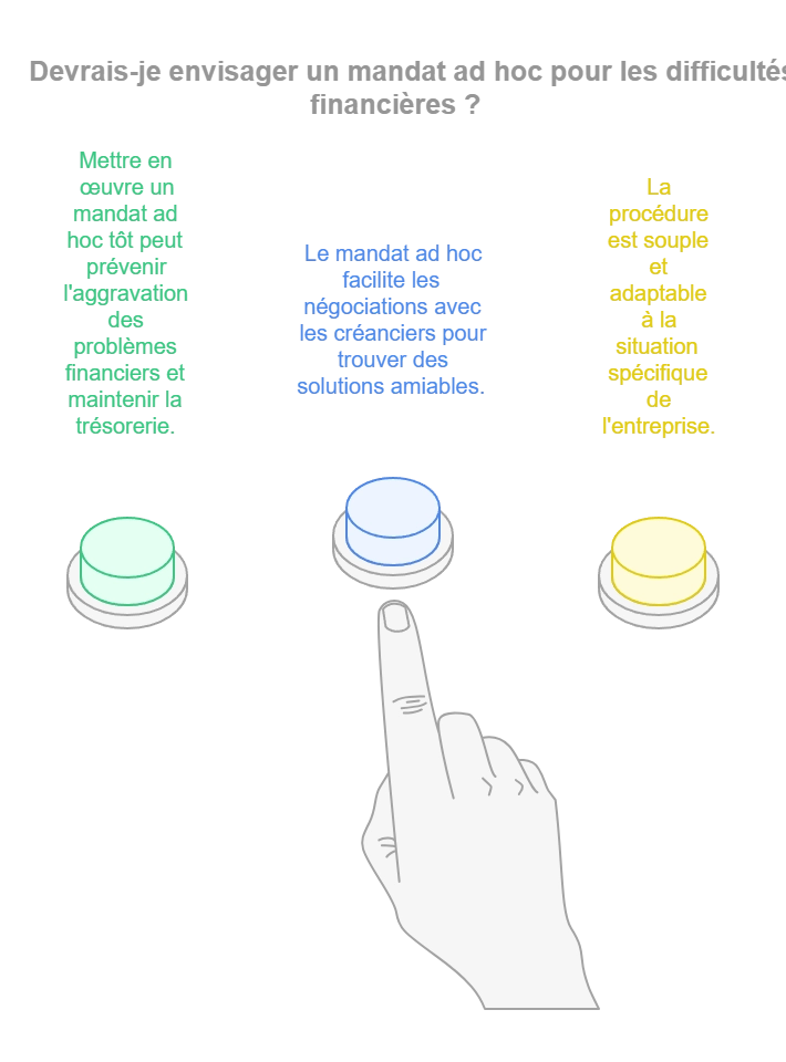 Pour faire simple : le mandat ad hoc intervient avant la crise majeure, pas après.