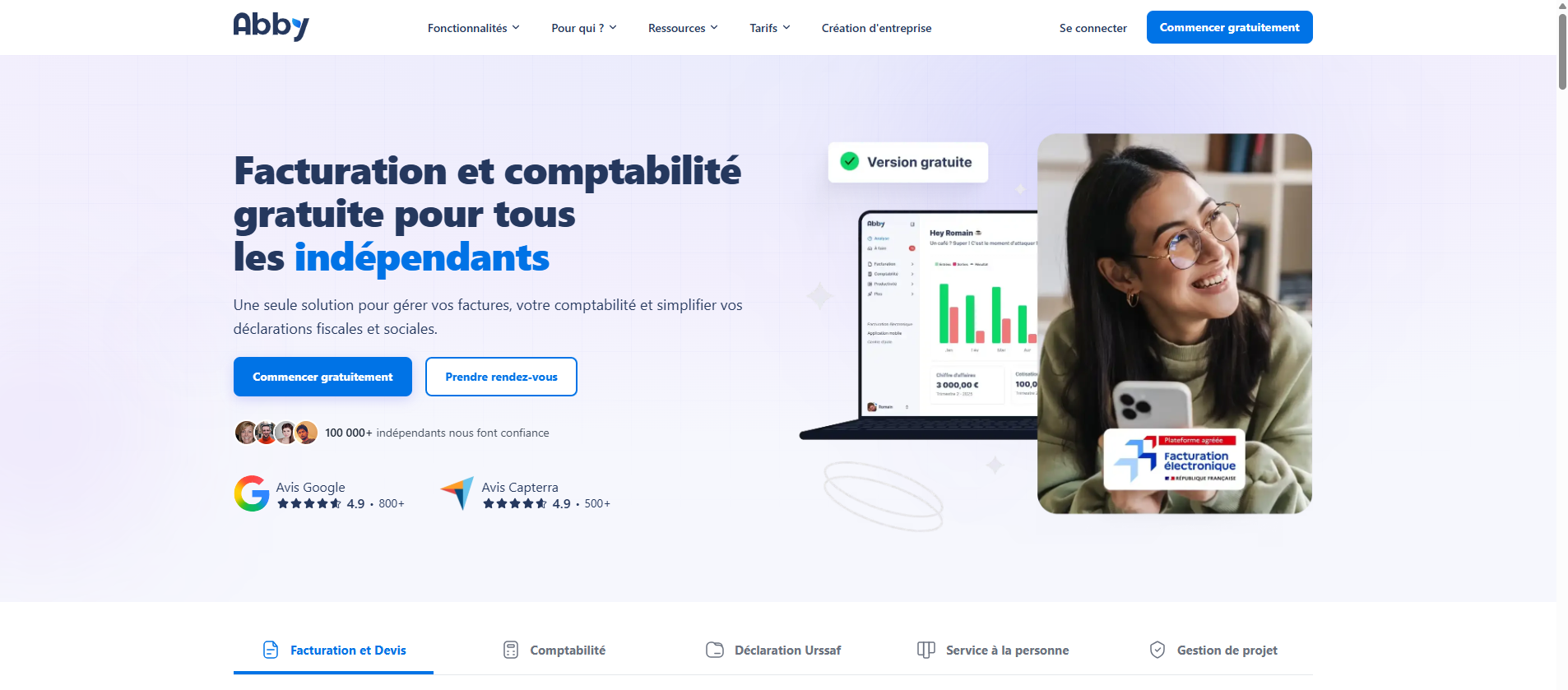 - ✅ Points forts : Facturation 100% gratuite, interface ultra-claire, télé-déclarations fiscales simplifiées.