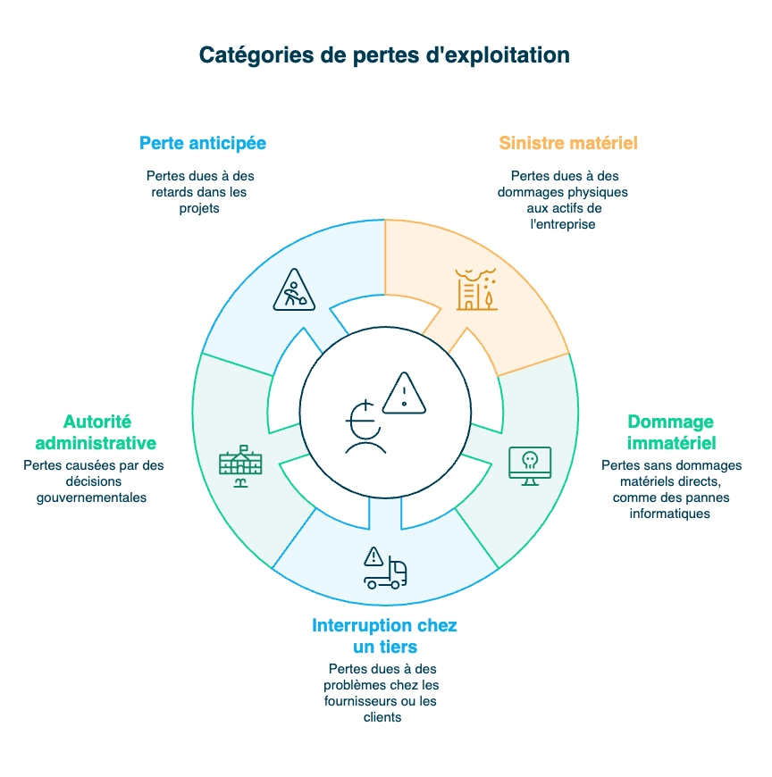 Les pertes d’exploitation peuvent être classées en plusieurs catégories selon leur origine et leur nature. Voici les plus courantes, mentionnées dans un contrat d’assurance, et leur signification pour votre protection.