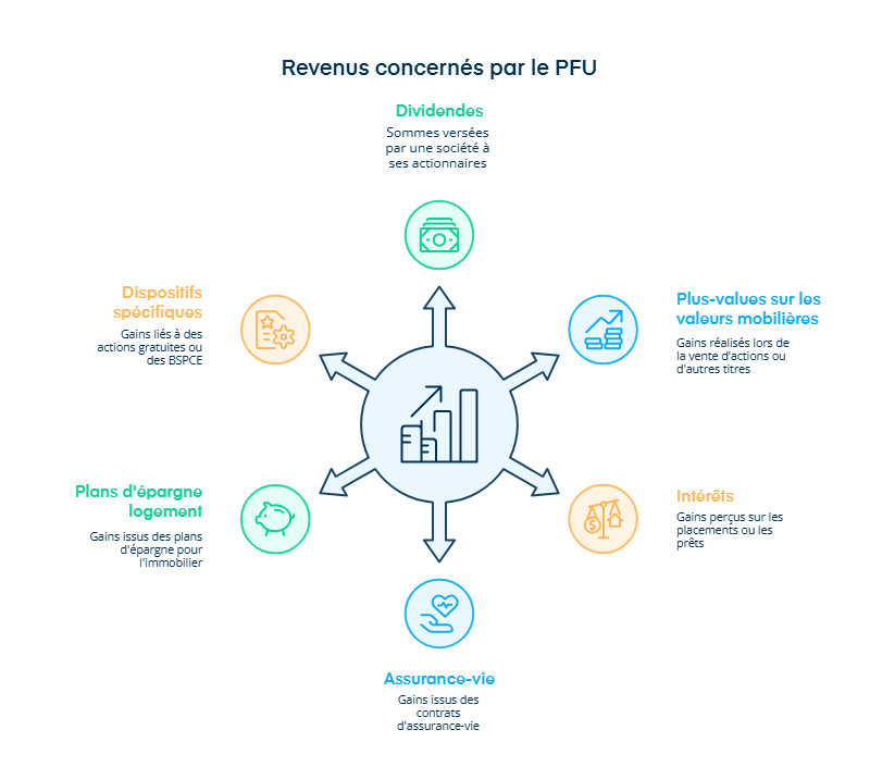 - Le PFU concerne la majorité des revenus du capital : dividendes, intérêts, plus-values, etc.