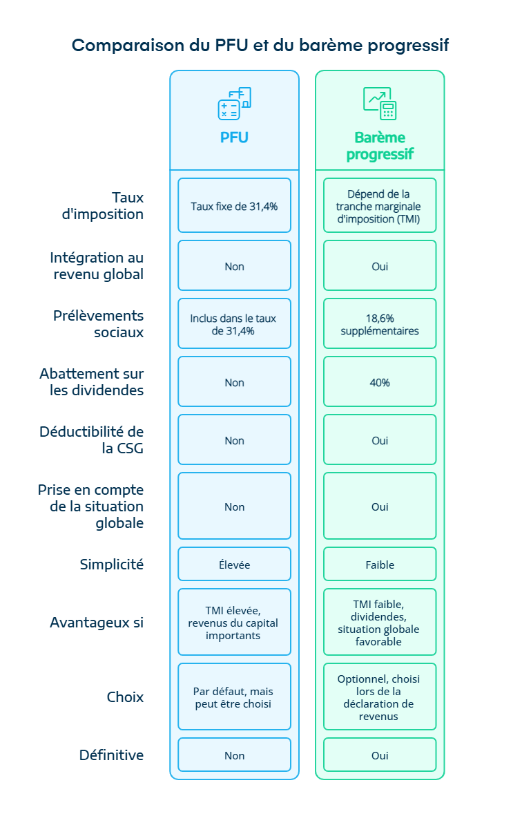 - Le PFU est le régime par défaut, mais vous pouvez opter pour le barème progressif de l’impôt sur le revenu.