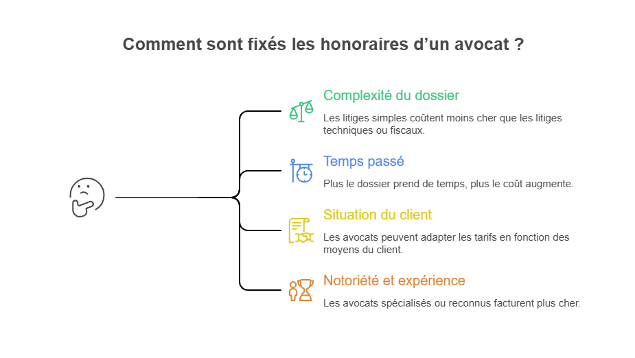 - Liberté des honoraires (art 10 de la loi du 31 décembre 1971) : chaque avocat fixe ses prix librement, en fonction de plusieurs critères légaux (complexité, temps, situation du client) ;
