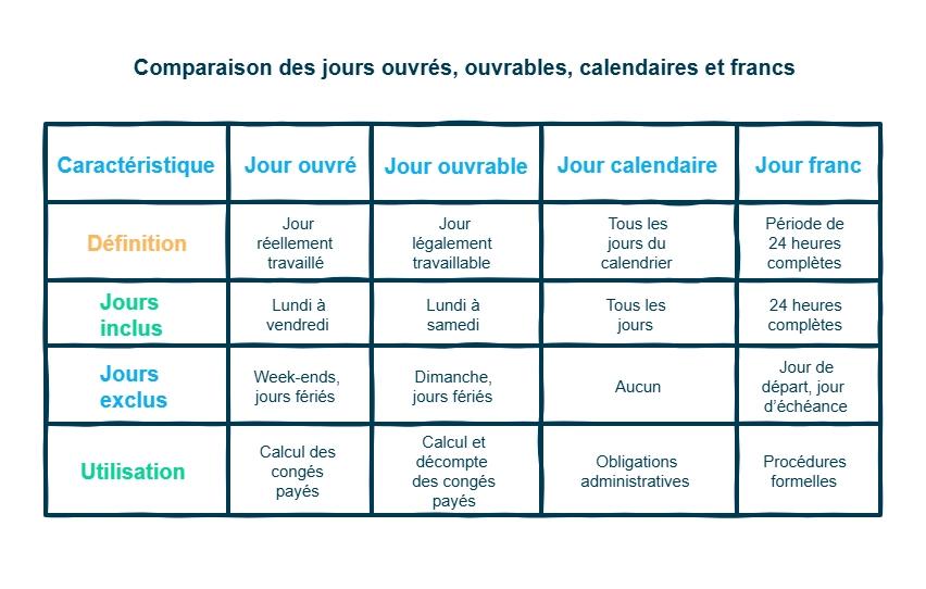 Ces notions servent surtout aux délais légaux. Le jour calendaire correspond à tous les jours du calendrier. Il inclut week-ends, jours fériés et jours chômés. Il est utilisé pour certaines obligations administratives.