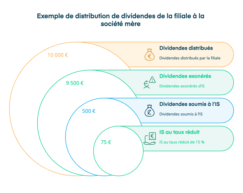 Prenons l’exemple d’une société mère percevant 10 000 € de dividendes d’une de ses filles. Seuls 5 % des dividendes reçus, soit 500 €, subiront l’IS, soit 75 € d’IS au taux réduit de 15%.