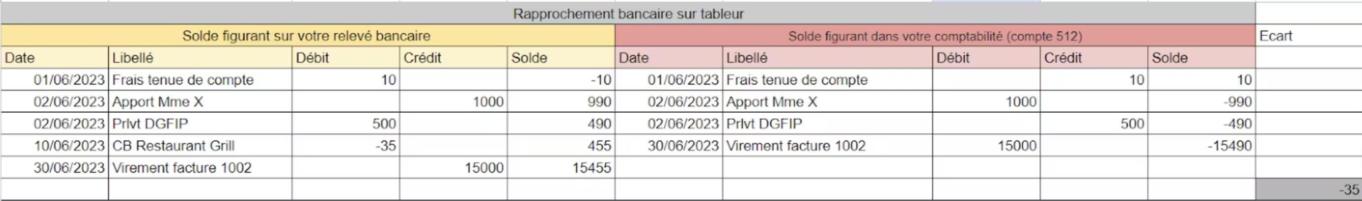 Pour vous aider à y voir plus clair on vous a fait un petit exemple de tableau illustrant un rapprochement bancaire !