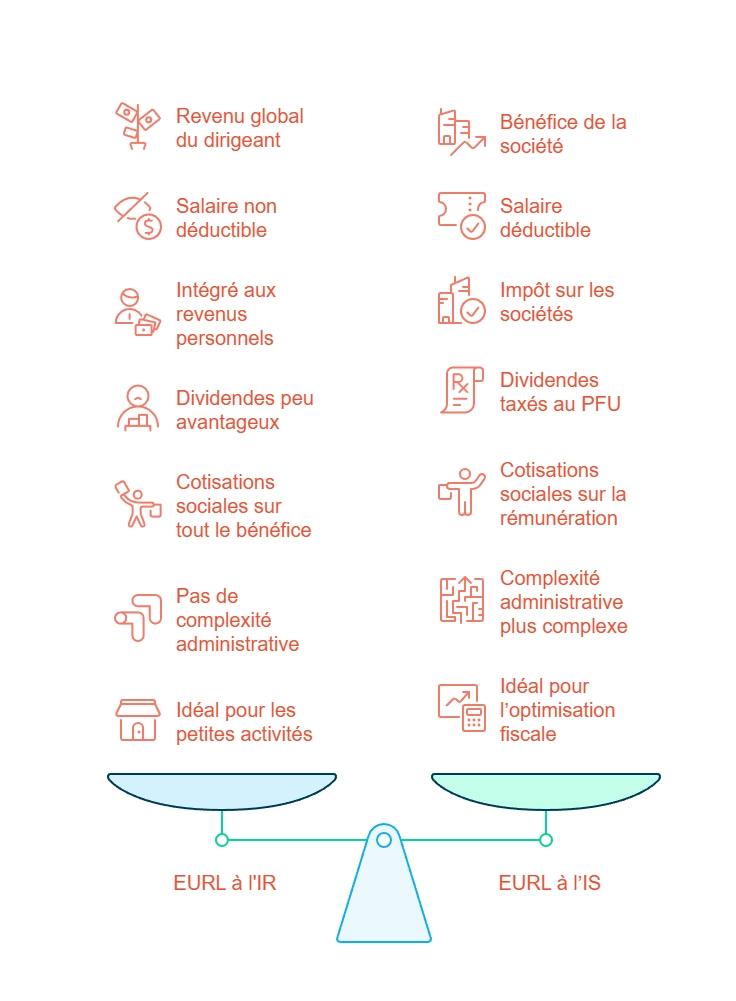La fiscalité est un autre élément central. L’imposition dépend du choix entre EURL à l’IR et EURL à l’IS.