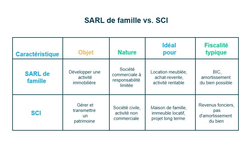 - Si vous cherchez la rentabilité à court terme, la SARL de famille est idéale. Pour construire et transmettre votre patrimoine, la SCI reste la meilleure option.