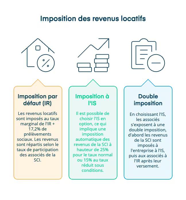 L'imposition des revenus locatifs, par défaut, en SCI, se fait au taux marginal de l'IR + 17,2% de prélèvements sociaux. Les revenus sont répartis selon le taux de participation des associés de la SCI. Il est aussi possible de choisir l'IS en option, ce qui implique une imposition automatique des revenus de la SCI à hauteur de 25% pour le taux normal ou 15% au taux réduit sous conditions (bénéfices jusqu'à 42500 € en 2025).