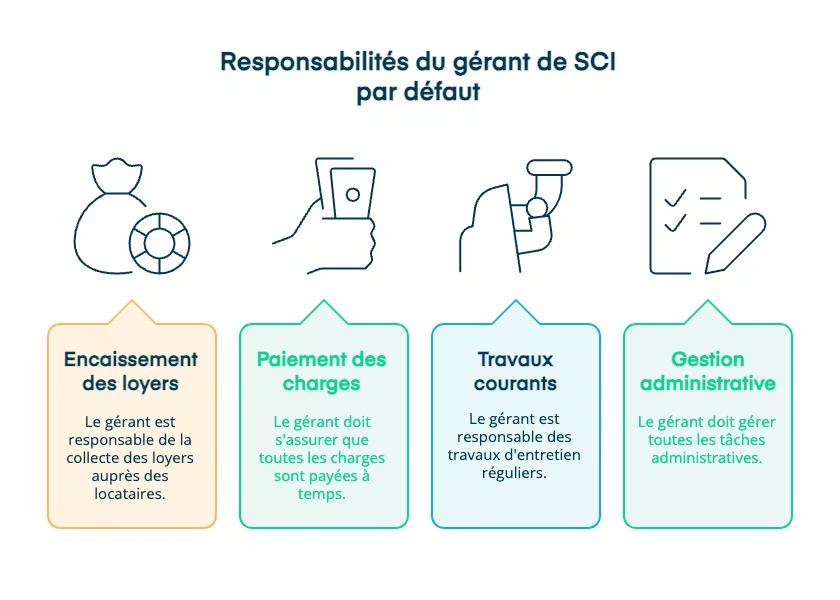La gestion et la prise de décision en SCI est déterminée par les statuts de l'entreprise. Le gérant est néanmoins, par défaut, le responsable de la gestion courante :