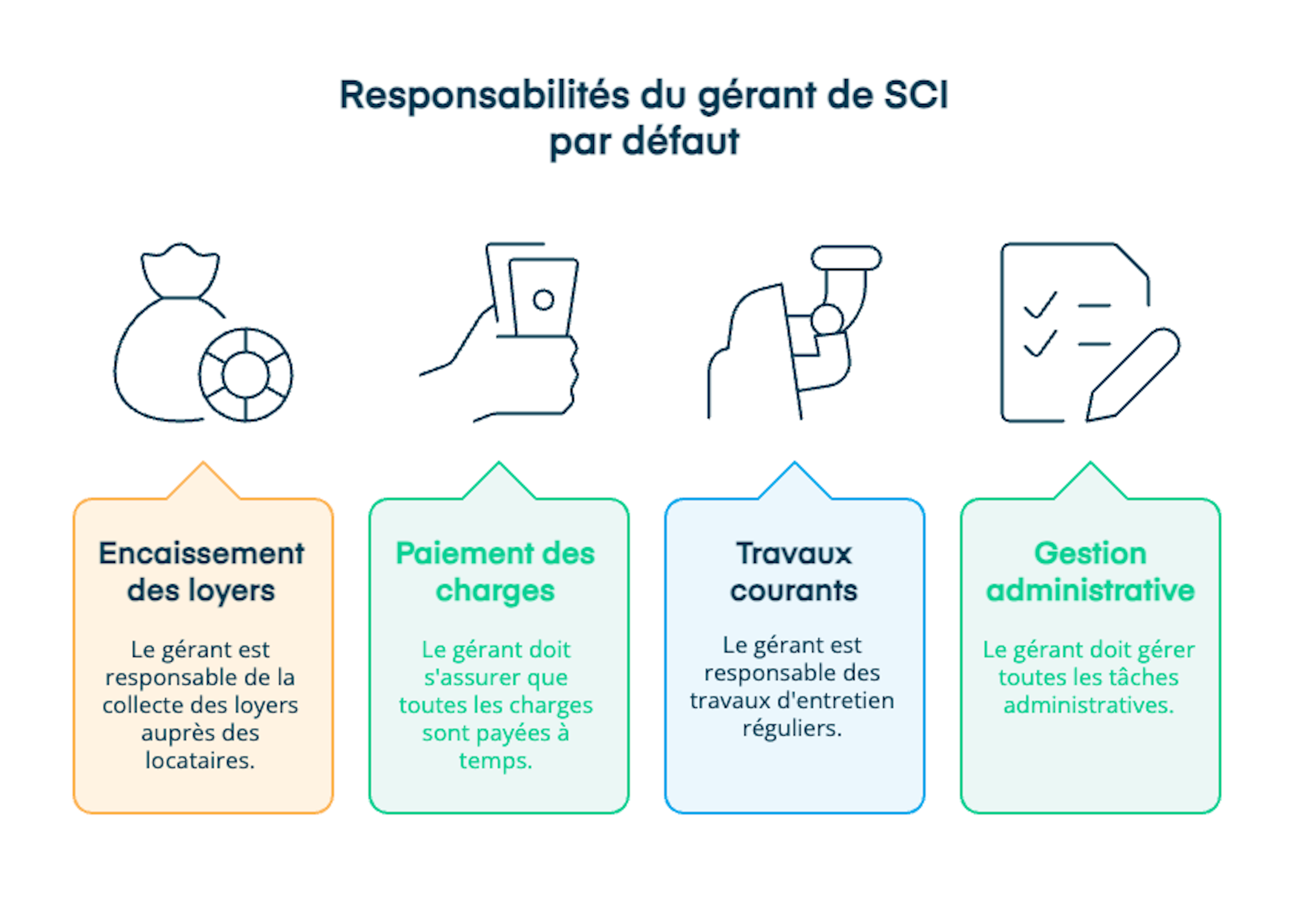 La gestion et la prise de décision en SCI est déterminée par les statuts de l'entreprise. Le gérant est néanmoins, par défaut, le responsable de la gestion courante :