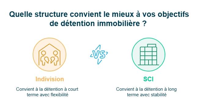 - Choisir entre SCI et indivision dépend de vos objectifs : stabilité et transmission à long terme pour la SCI, simplicité et flexibilité à court terme pour l'indivision.