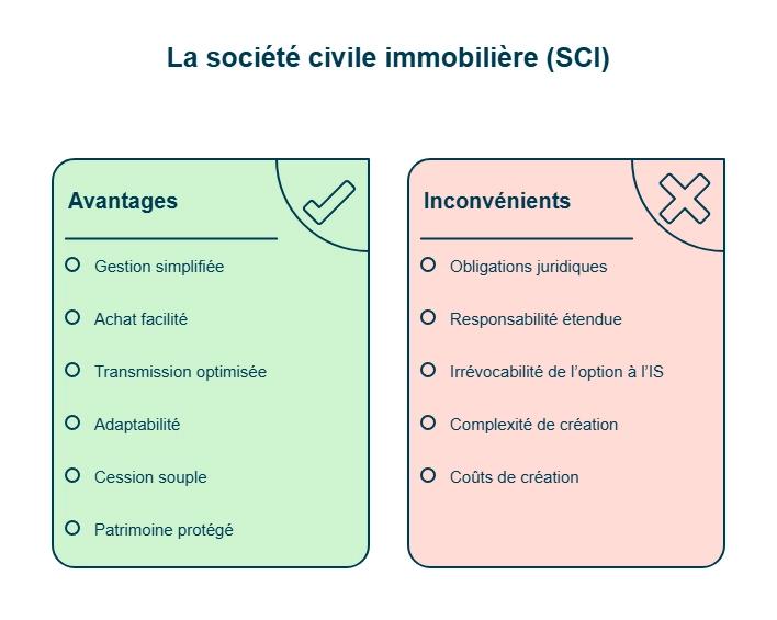 Pour résumer le fonctionnement d'une SCI, c'est une entité juridique permettant la gestion d'un patrimoine immobilier et elle peut être formée par au moins deux associés. Le capital social est constitué par les apports des associés et est divisé en parts sociales, détenues proportionnellement aux apports de chaque associé. La SCI est dirigée par un gérant, choisi parmi les associés ou non, qu'il soit une personne physique ou morale. Au niveau de la fiscalité de la SCI, vous pouvez choisir entre l'impôt sur le revenu (IR) et l'impôt sur les sociétés (IS pour votre SCI. Enfin, la transmission des parts sociales est plus aisée que celle des biens en indivision, permettant une transmission simplifiée aux héritiers sans formalités complexes.