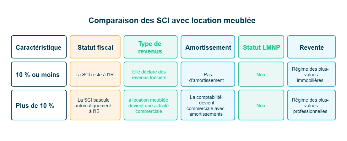 - En pratique, si les recettes issues de la location meublée dépassent environ 10 % des recettes totales HT de la SCI, l’administration peut considérer l’activité comme commerciale et entraîner un assujettissement à l’impôt sur les sociétés (IS). La location meublée saisonnière en SCI reste toutefois particulièrement sensible : le seuil de 10 % constitue un simple repère et ne sécurise pas à lui seul l’absence d’assujettissement à l’IS.