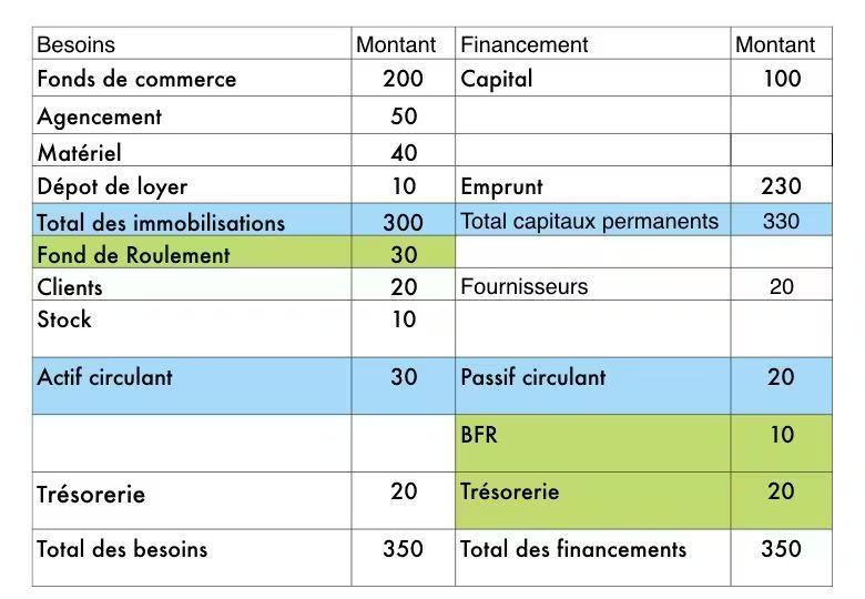 🔍 Dans l’exemple bilan, le montant des capitaux permanents s’élève à 330 K€ et le total des immobilisations est de 300 K€. Ainsi, le fonds de roulement représente la différence, soit 30 K€.