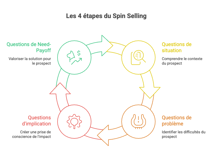 Le Spin Selling est une méthode de vente développée par Neil Rackham qui repose sur un questionnement structuré. L’objectif est de comprendre en profondeur les besoins du prospect avant de proposer une solution, en guidant la conversation à travers quatre types de questions : Situation, Problème, Implication et Need-Payoff.