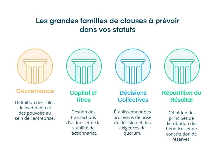Toutes ces mentions constituent la structure de base de votre société. Elles fixent le cadre, mais ne suffisent pas à tout encadrer. Pour aller plus loin, il faut ajouter des clauses obligatoires de fonctionnement, qui précisent comment vous prendrez les décisions ou comment seront gérés les mouvements d’actions.