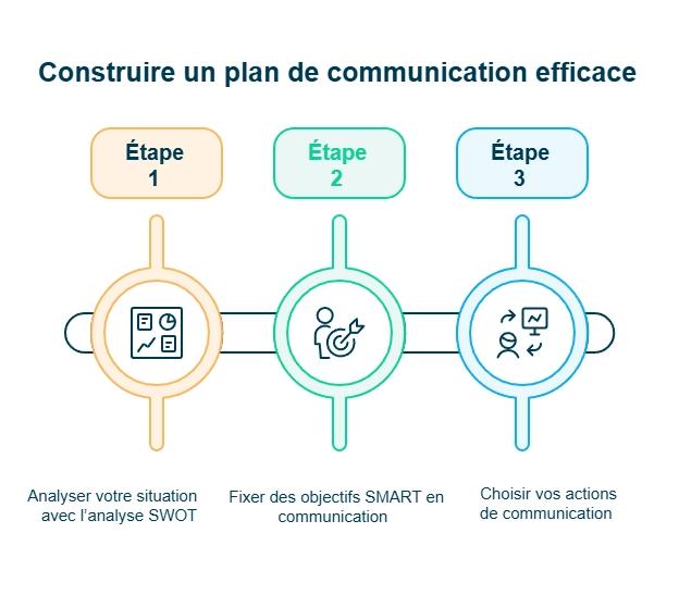 Mettre en place une stratégie de communication permet surtout de structurer vos actions et d’éviter de communiquer au hasard. Pour démarrer, retenez quelques étapes essentielles :