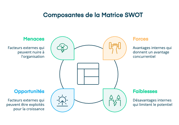L’objectif final est de formuler des recommandations stratégiques en croisant les éléments : utiliser une force pour saisir une opportunité, contrer une menace ou corriger une faiblesse.
