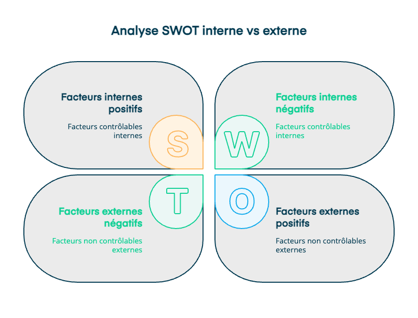 Les facteurs internes correspondent à ce qu’il y a à l’intérieur de votre organisation, des éléments sur lesquels l’organisation a un pouvoir. Les facteurs externes correspondent à ce qu’il y a à l’extérieur de l’entreprise, des éléments sur lesquels votre société n’a pas vraiment de pouvoir, et il faut aussi prendre en compte les éléments qui vont arriver dans le futur.