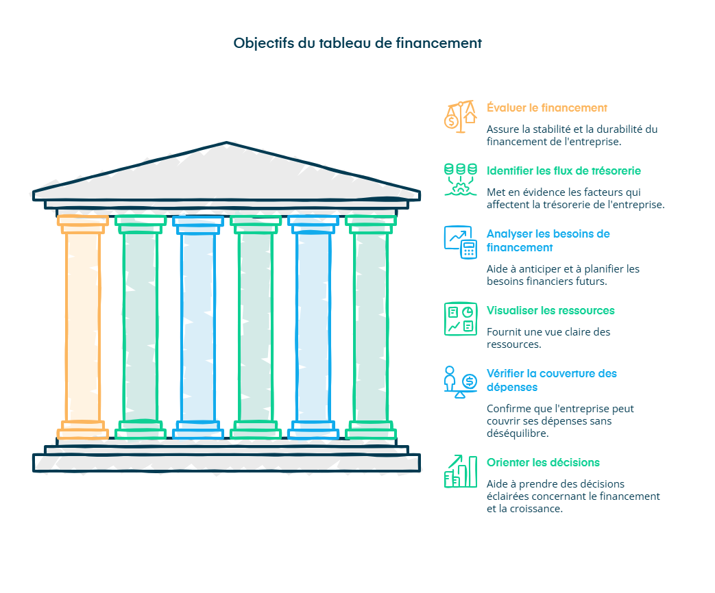 - En mettant en regard les emplois et les ressources, puis en analysant les variations du fonds de roulement et du besoin en fonds de roulement, il offre une lecture claire de l’équilibre financier et des zones de tension éventuelles.