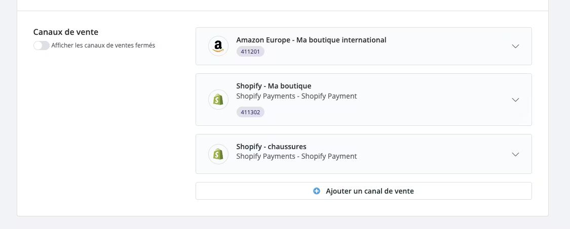La configuration des canaux de vente inclut la ventilation des ventes et des commissions, ce qui vous permet de suivre les coûts associés. Le module facilite également la génération automatique des déclarations de TVA, adaptées aux spécificités nationales, européennes ou internationales. Voici à quoi ressemblent vos différents canaux de vente après les avoir configurer :