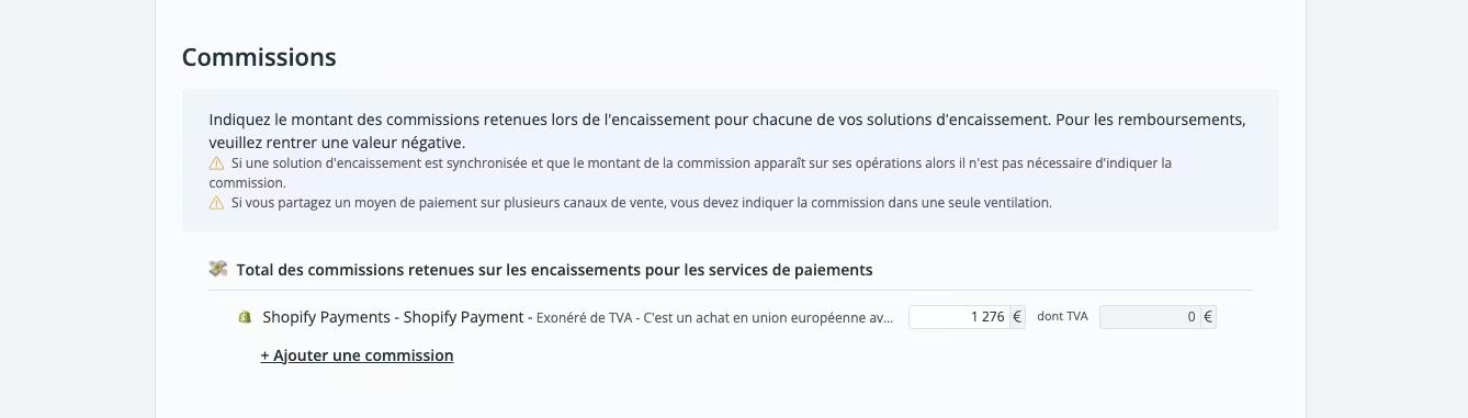 La ventilation des opérations regroupe les ventes par taux de TVA et par pays, évitant une manipulation manuelle pour chaque vente. Chaque canal de vente génère un rapport mensuel, intégrant les ventes et les frais de service des plateformes. Par exemple, vous pouvez visualiser vos commissions par plateforme de cette manière :