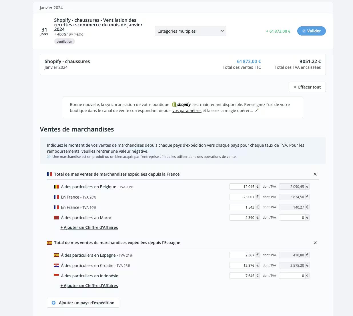 Voici un exemple de ventilation pour un e-commerce qui expédie des marchandises depuis la France et l’Espagne à des particuliers de différents pays (en Union Européenne ou en dehors) et avec plusieurs taux de TVA :